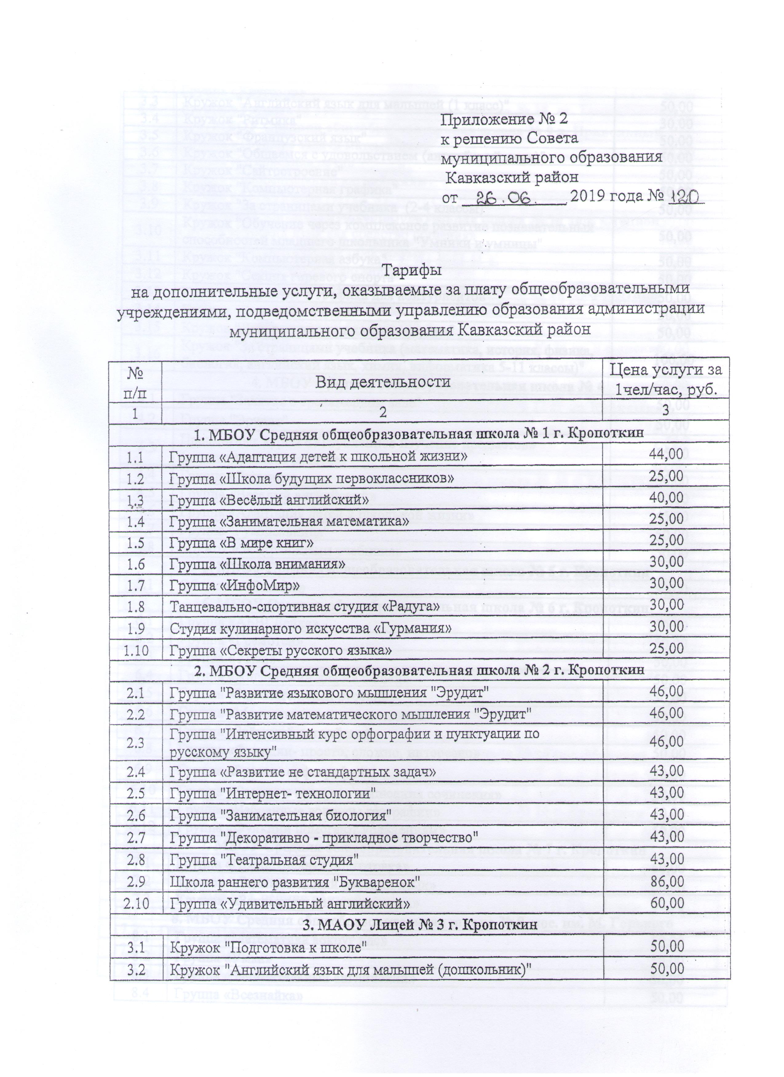 РЕШЕНИЕ от 26 июня 2019 года № 120 город Кропоткин "Об утверждении тарифов на дополнительные услуги, оказываемые за плату муниципальными образовательными учреждениями, подведомственными управлению образования администрации муниципального образования Кавказский район" - скачать