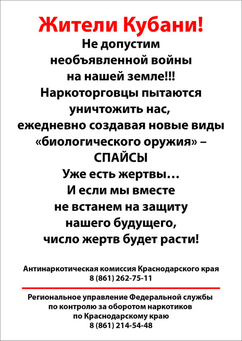 Чем больше становится наркозависимых, тем меньше шансов уберечься у оставшейся молодежи. Статистика неумолима: один наркоман вовлекает еще 15–17 человек. Не спасают ни положение, ни связи, ни деньги.Всех, кому не безразлично будущее наших детей, всех, кто осознает опасность сложившейся ситуации, независимо от пола и возраста, вероисповедания и политических пристрастий антинаркотическая комиссия муниципального образования Кавказский район приглашает к сотрудничеству.